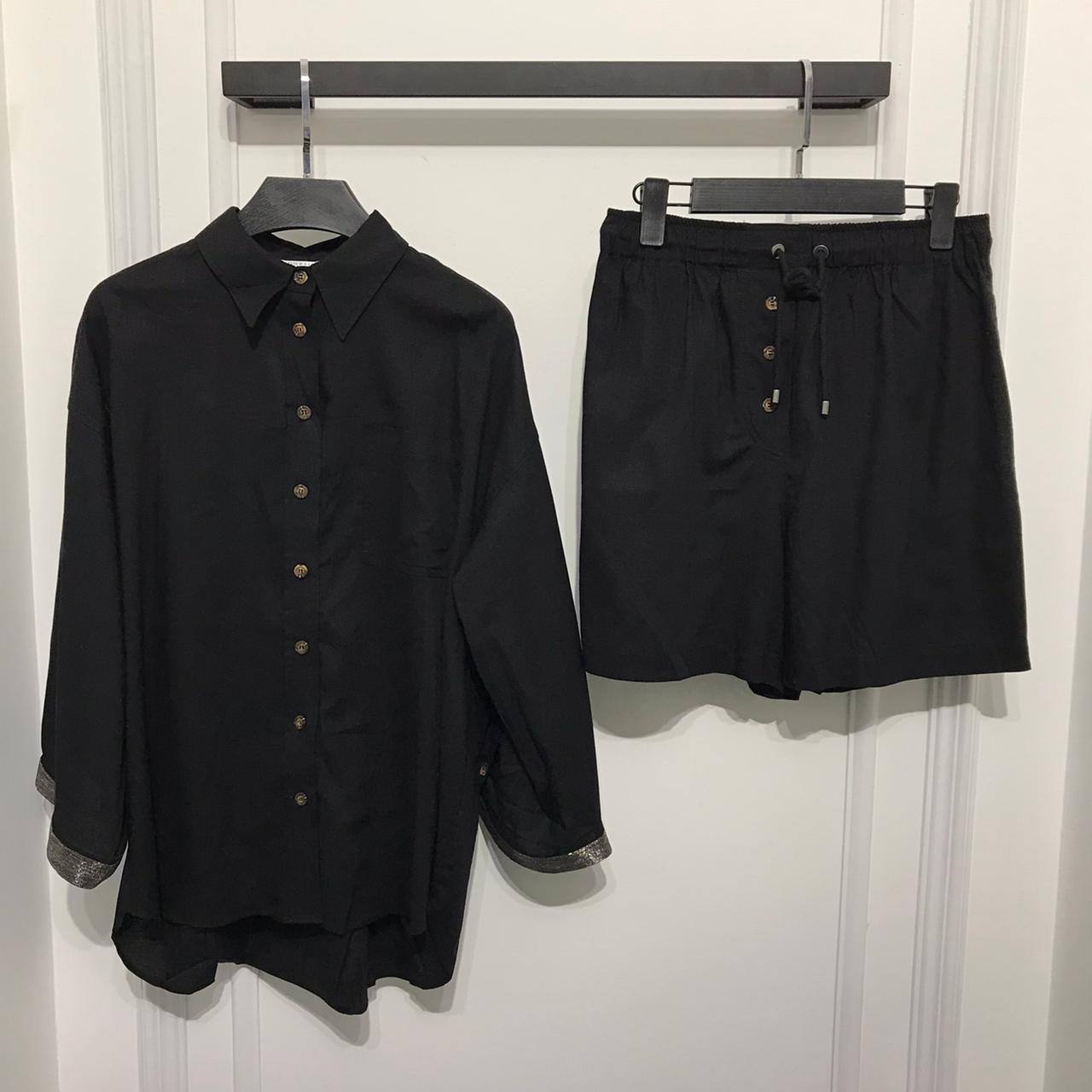 Элегантный женский костюм от Brunello Cucinelli, состоящий из рубашки с длинным рукавом и шорт, выполненный в классическом стиле. Идеальный выбор для создания утонченных образов.