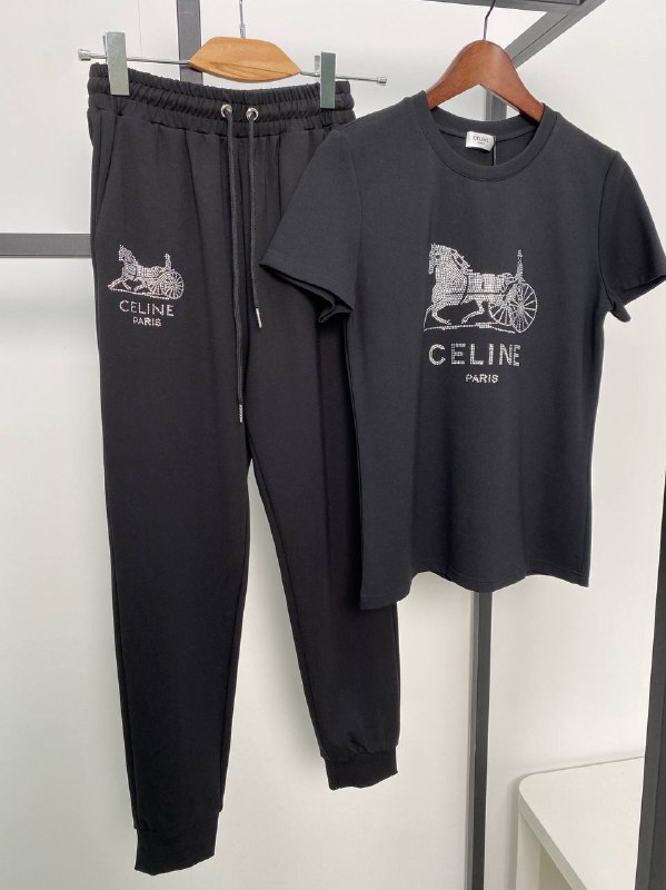 Этот стильный костюм Celine LUX-55795, состоящий из футболки и брюк, выполнен в классическом черном цвете и украшен эффектным принтом с изображением лошади и колесницы, инкрустированным стразами. Универсальный крой и комфортные материалы делают его идеальным выбором для повседневной носки, прогулок или занятий спортом.