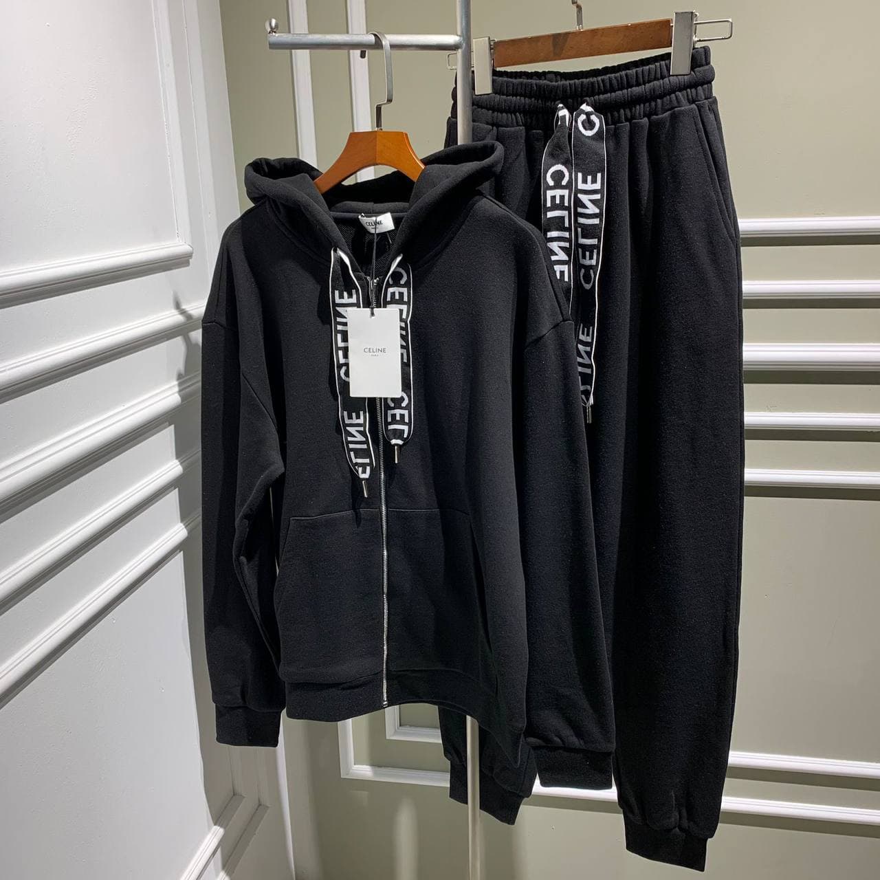 Спортивный костюм Celine LUX-57353 – это стильный и комфортный комплект, сочетающий в себе спортивный дизайн и элементы высокой моды. Набор выполнен в лаконичном черном цвете, дополненный фирменной символикой бренда, что придает ему элегантность. Такой костюм идеально подойдет для создания расслабленных, но в то же время трендовых образов, как для активного отдыха, так и для повседневной носки.