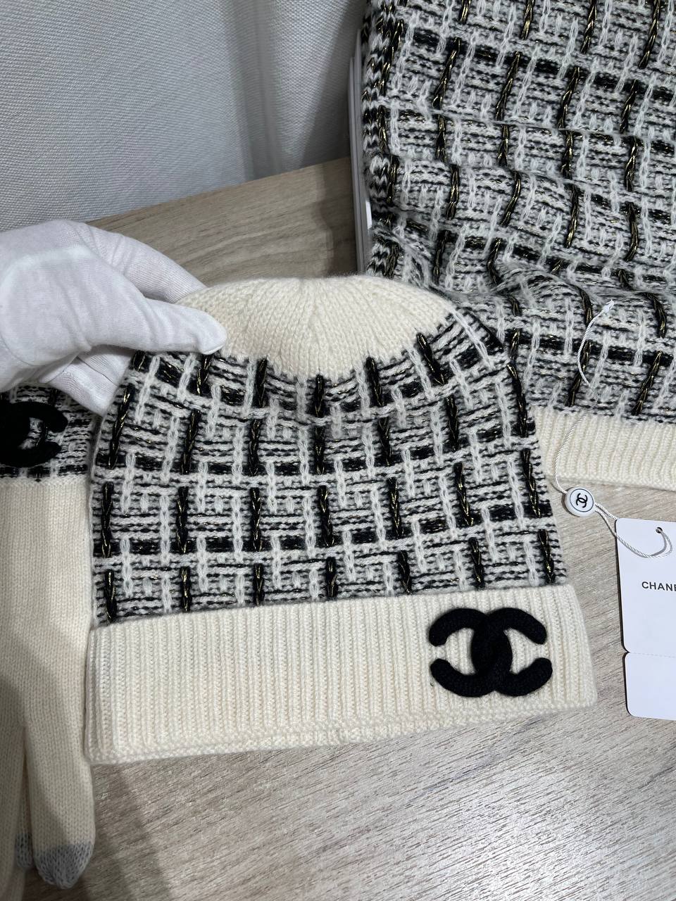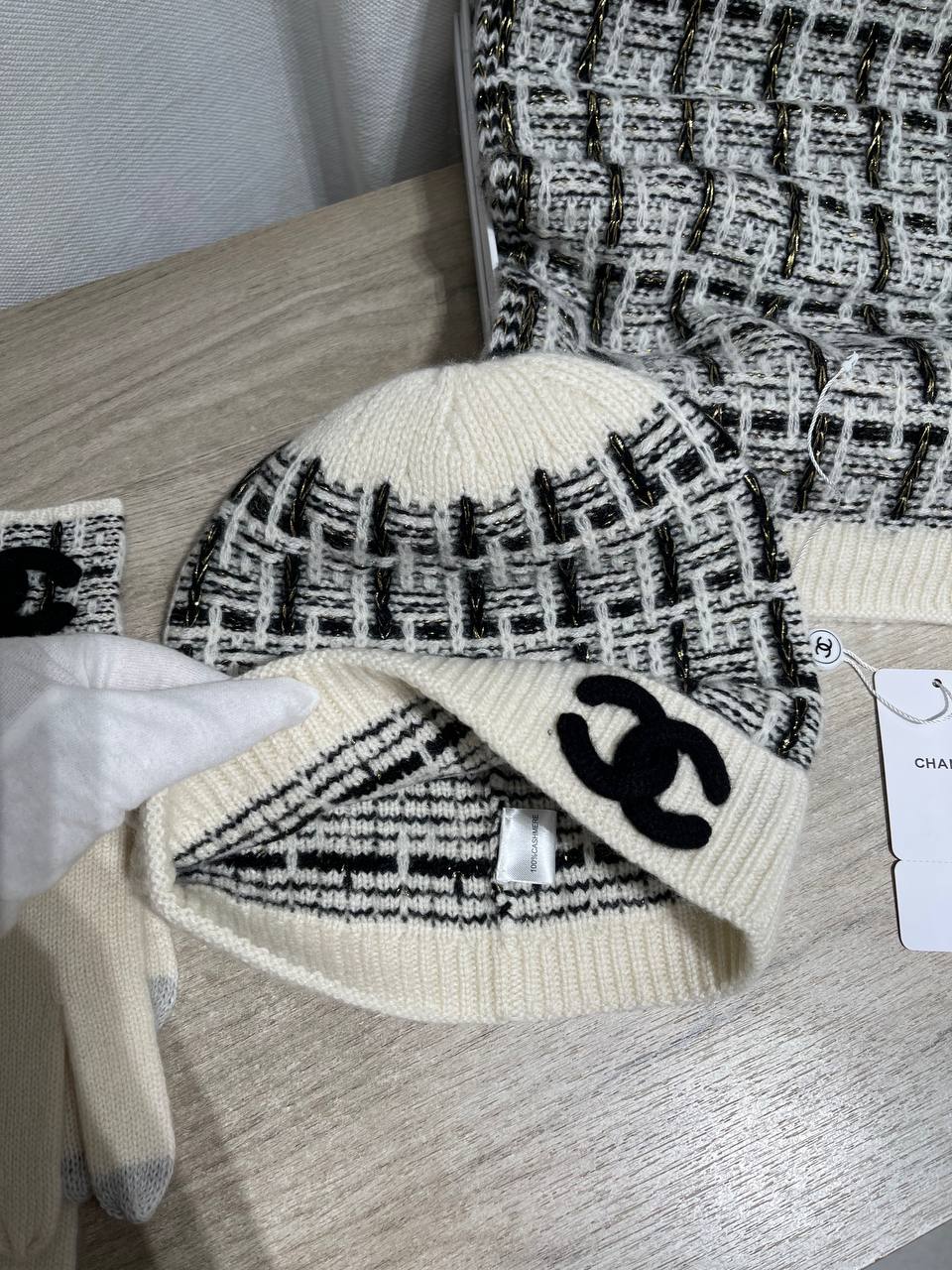Комплект Chanel LUX-128655 - элегантный и стильный набор, который подчеркнет ваш изысканный вкус. В комплект входят шапка, шарф и перчатки, выполненные в едином дизайне. Этот аксессуар станет прекрасным дополнением к вашему гардеробу.