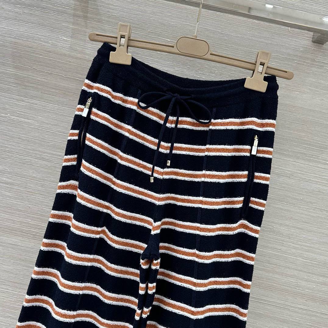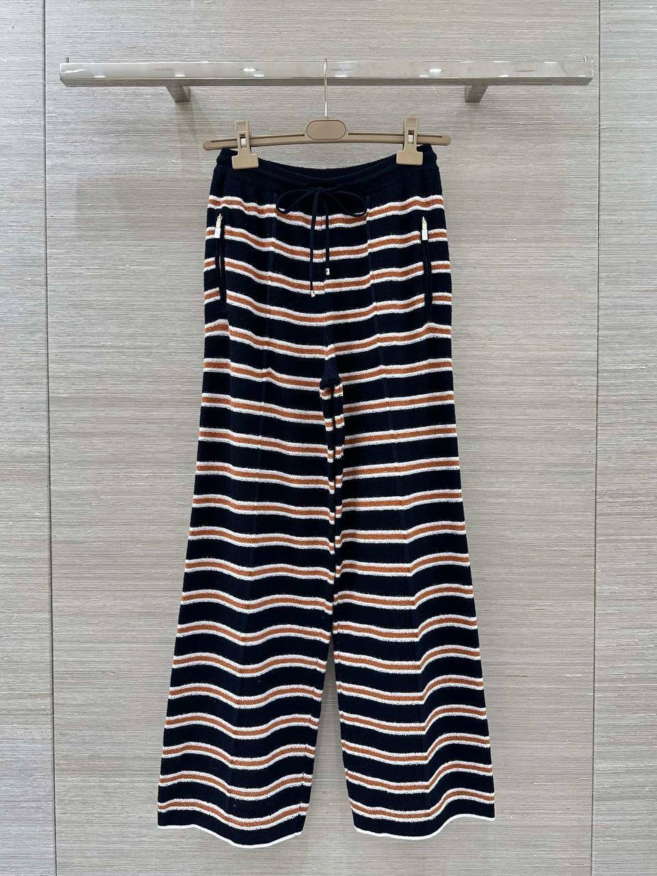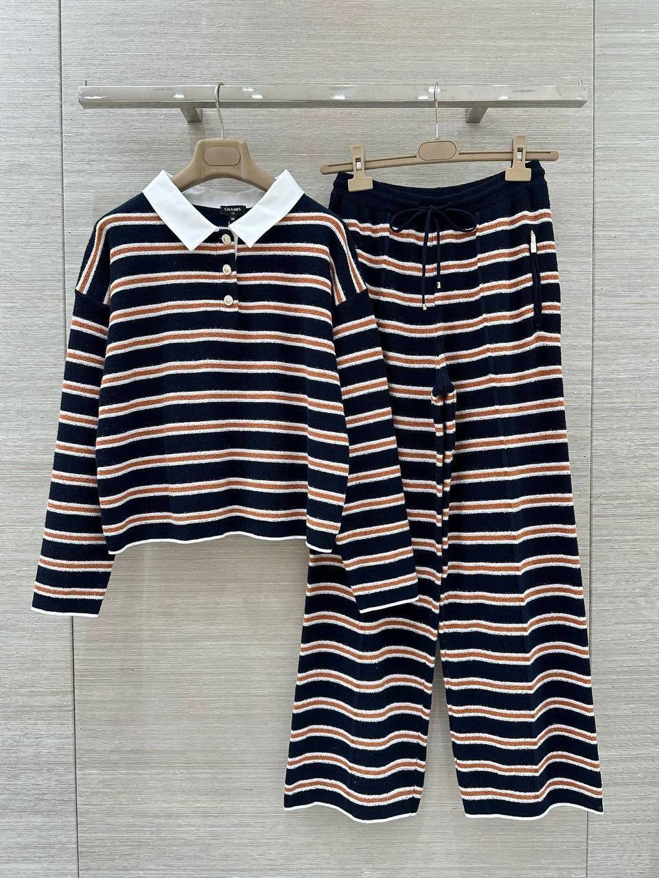 Женский костюм Chanel идеально подходит для создания элегантного и расслабленного образа. Костюм состоит из полосатого джемпера с отложным воротником и широких брюк на кулиске.