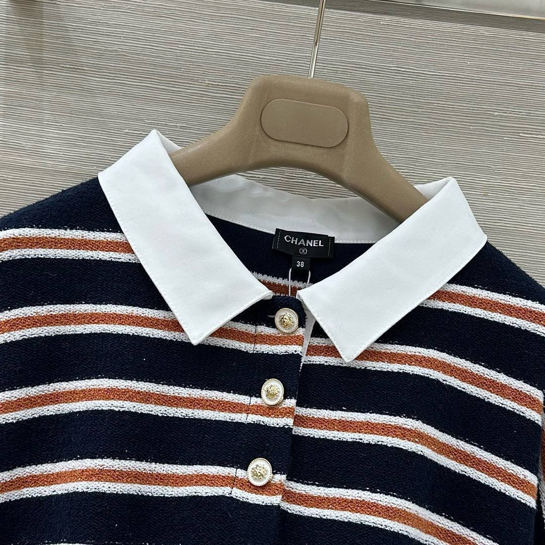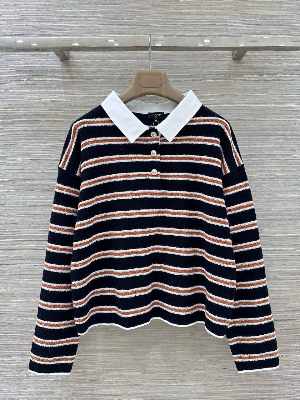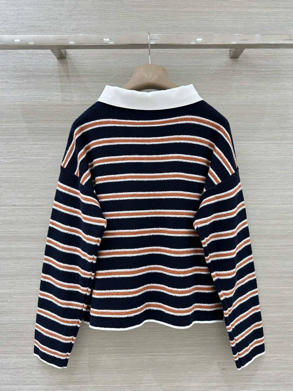 Женский костюм Chanel идеально подходит для создания элегантного и расслабленного образа. Костюм состоит из полосатого джемпера с отложным воротником и широких брюк на кулиске.