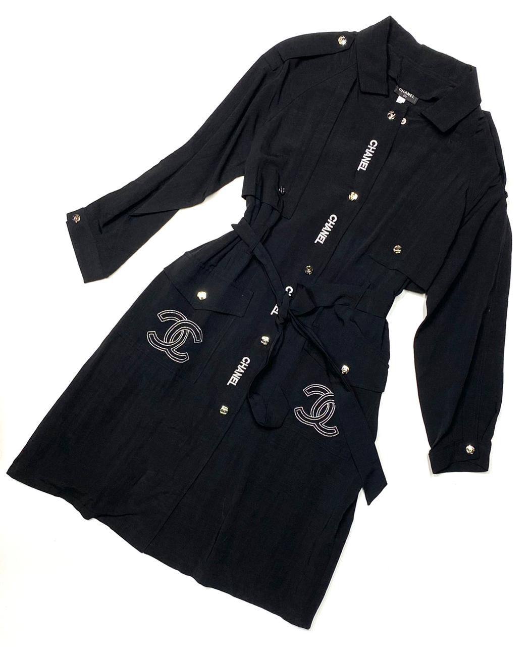 Элегантное платье рубашечного кроя от Chanel – это сочетание классики и современных тенденций. Модель выполнена в универсальном черном цвете, украшена логотипами бренда.