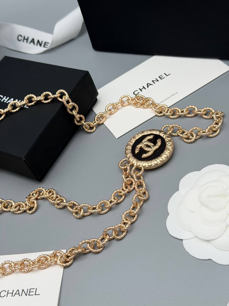 Пояс Chanel LUX-130009 - это стильный аксессуар, который добавит элегантности любому образу. Он выполнен в золотистом цвете и украшен фирменными логотипами бренда.