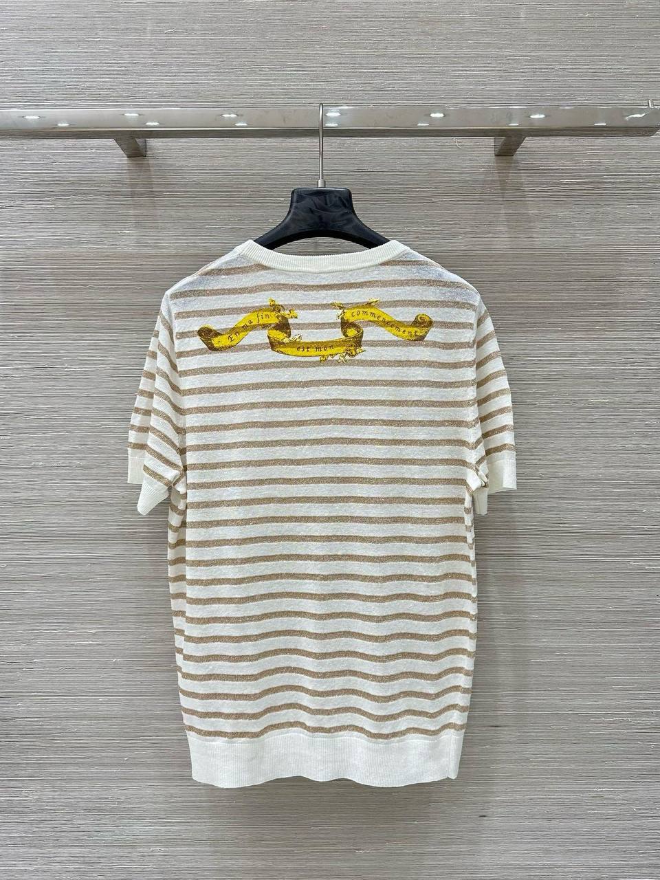 Футболка Christian Dior LUX-116568 — это стильная футболка в полоску, выполненная в нейтральных тонах. Дизайн включает в себя золотистые полосы на белом фоне, а также маленький карман с аппликацией в виде звезды. Она сочетает в себе повседневный стиль с элементами роскоши, что делает ее подходящей для различных образов.