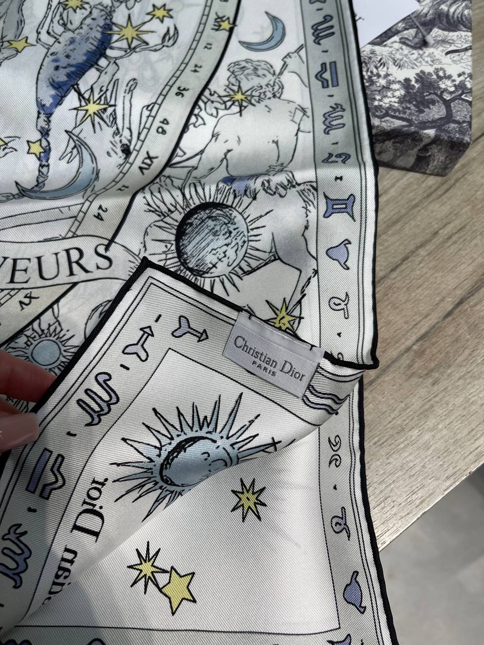 Платок Christian Dior LUX-130553 – это изысканный аксессуар, который добавит шарма любому образу. Модель выполнена в светлых тонах с оригинальным принтом в виде астрологических символов и созвездий. Платок станет прекрасным дополнением к вашему гардеробу.