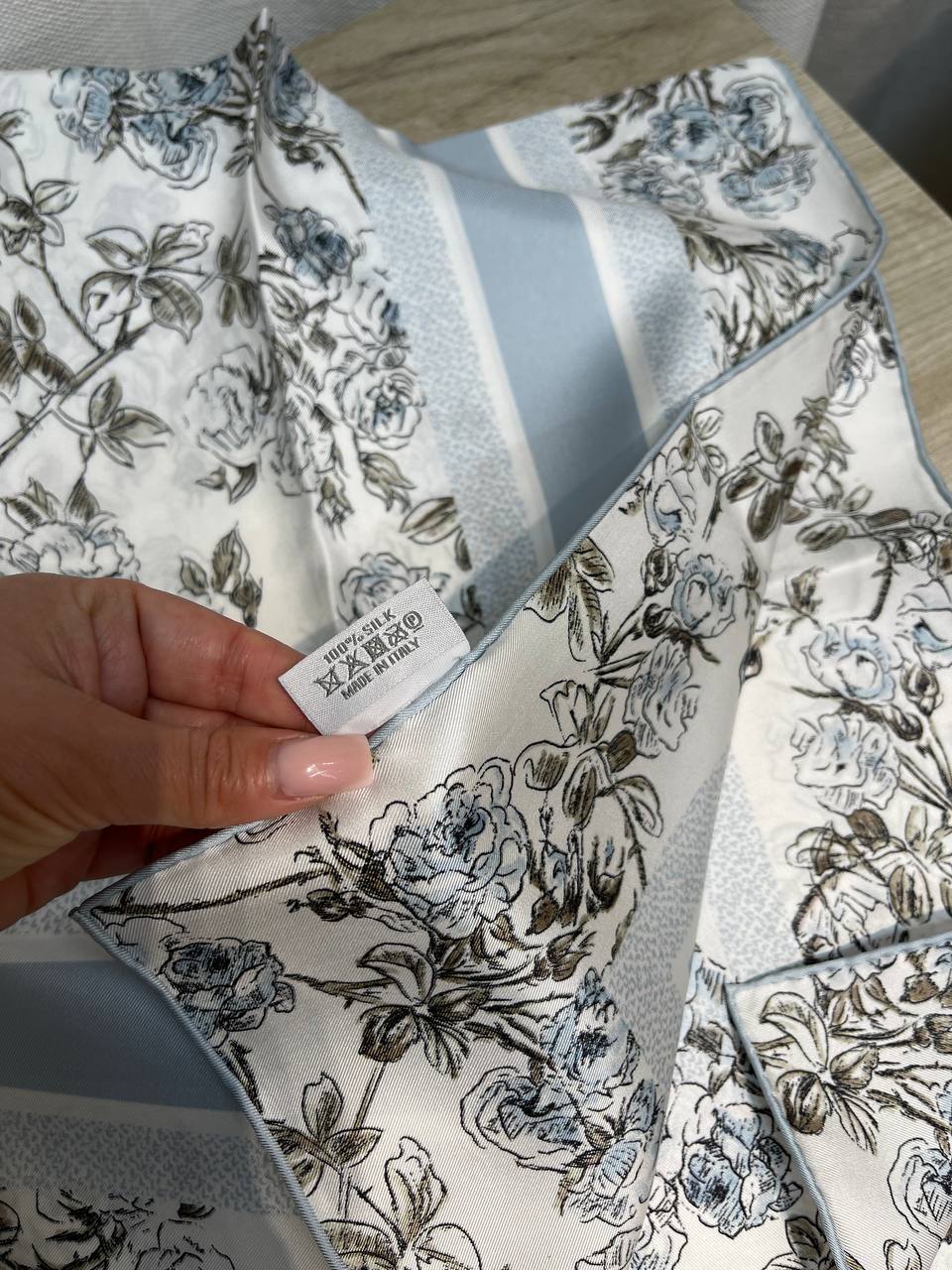 Платок Christian Dior LUX-130558 – это элегантный аксессуар, который подчеркнет ваш утонченный вкус. Нежный цветочный принт и фирменный логотип Dior придают ему изысканность и шарм.