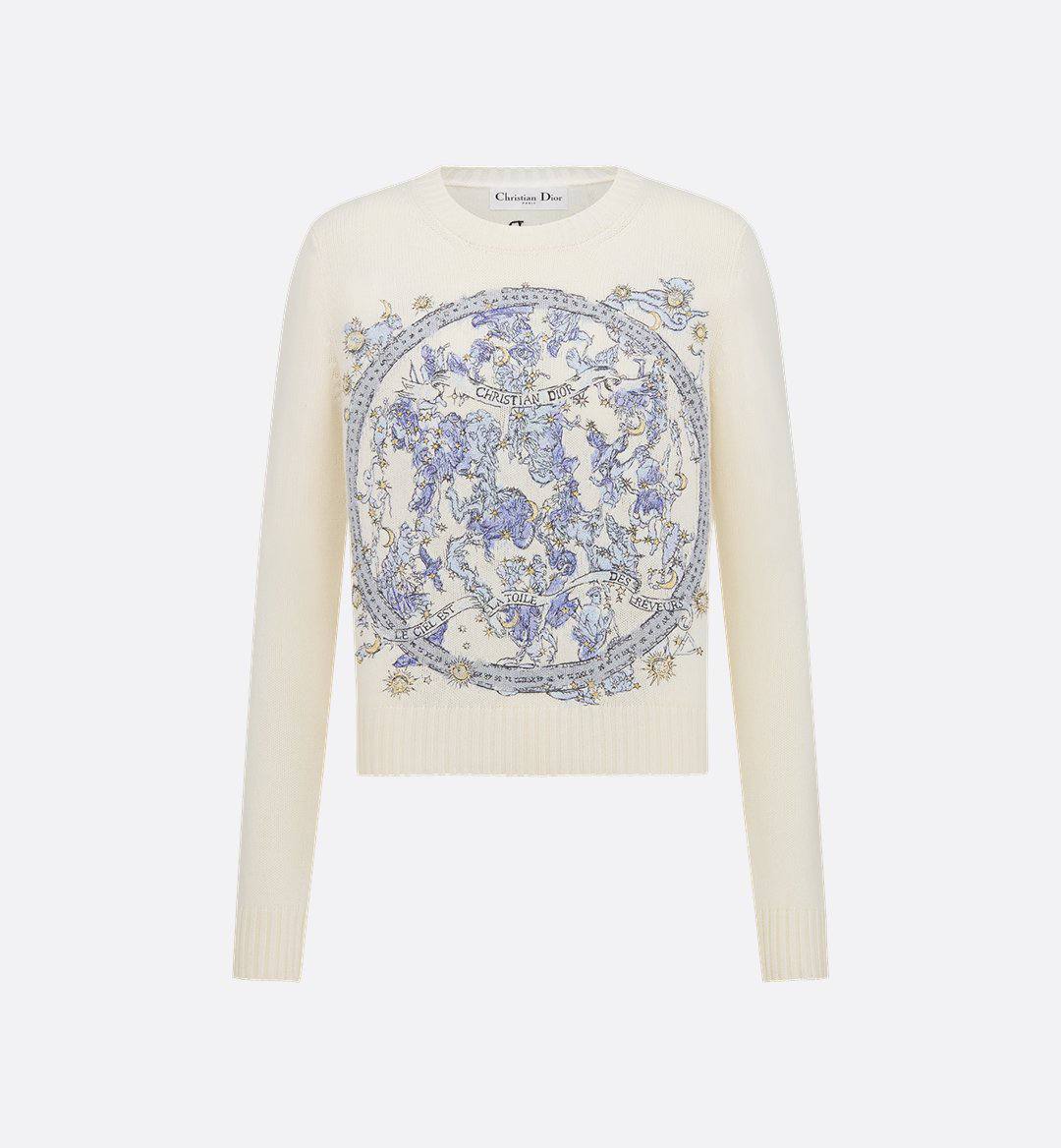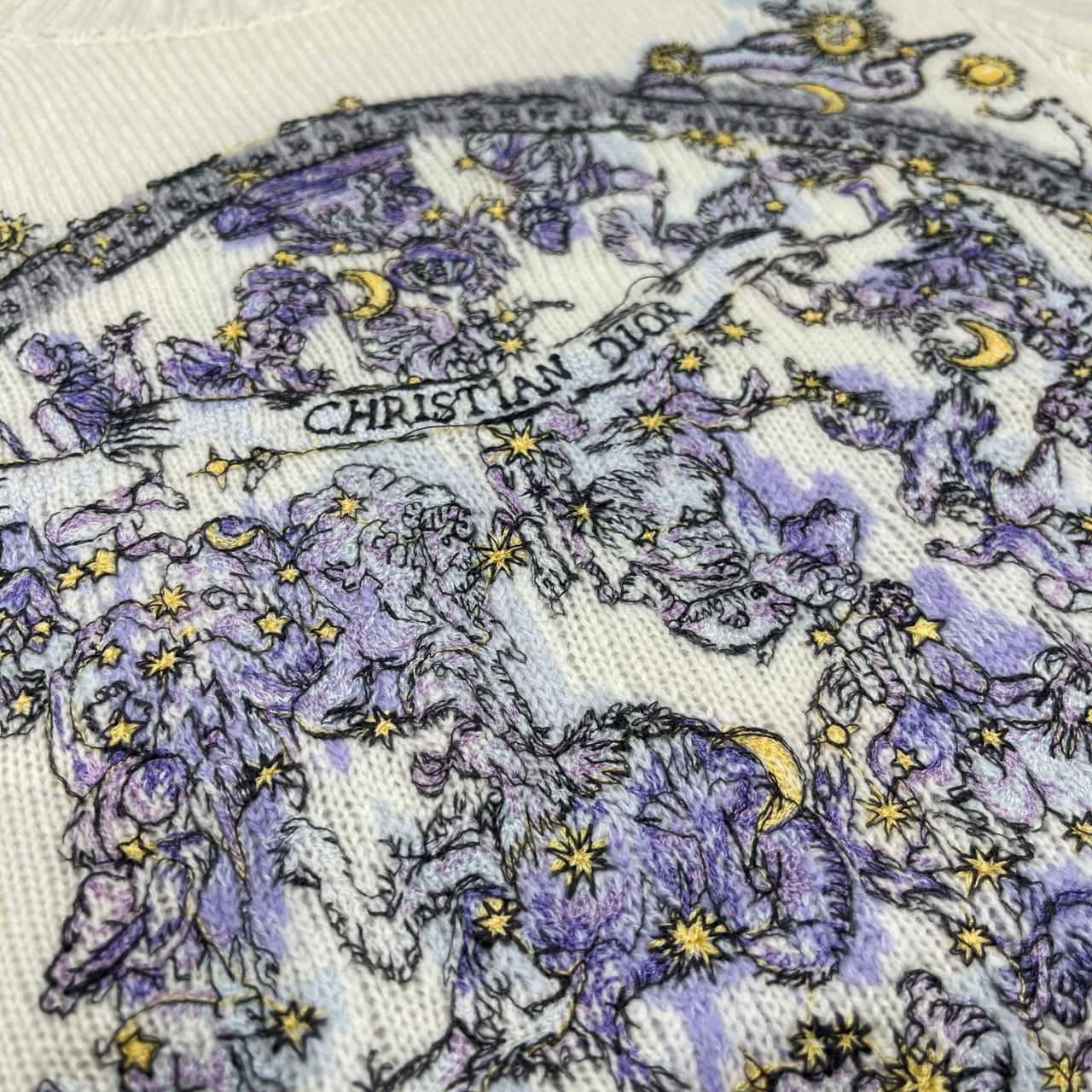 Элегантный женский свитер от Christian Dior – это сочетание классического стиля и изысканности. Свитер имеет нежный кремовый оттенок и украшен изящным цветочным узором на передней части.