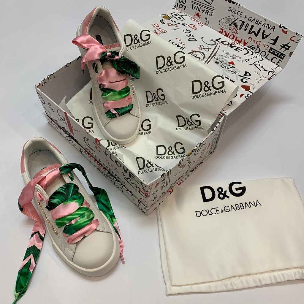 Эти кеды Dolce & Gabbana LUX-47817 представляют собой сочетание классического силуэта и ярких деталей. Белый цвет основы кед дополнен оригинальной шнуровкой в виде широких атласных лент с принтом в виде зеленых листьев и нежно-розовых акцентов. Такой дизайн делает обувь женственной и выразительной, подходящей для создания стильных повседневных образов.