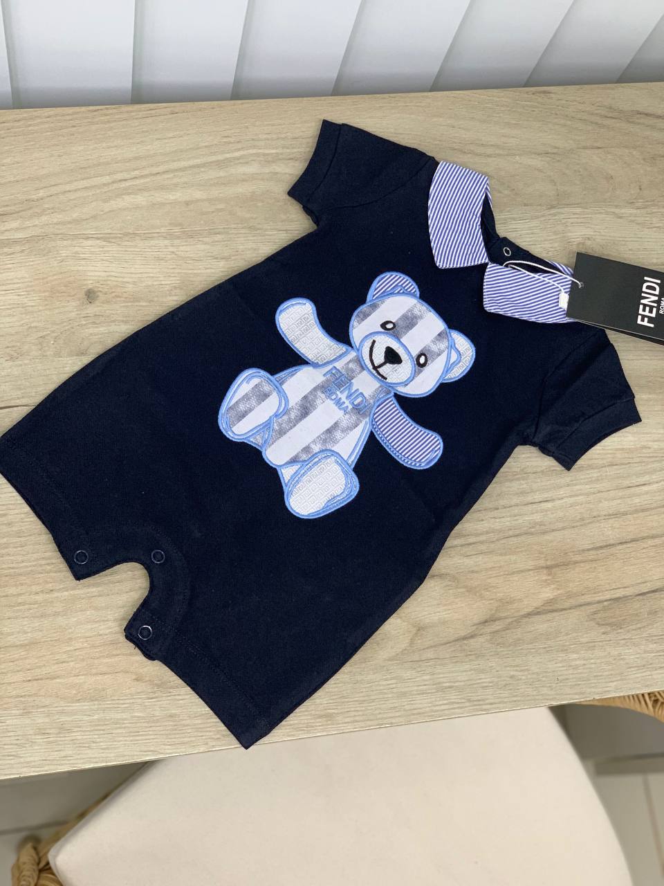 Песочник Fendi LUX-67390 – стильная и удобная одежда для малышей. Модель выполнена в темно-синем цвете и украшена аппликацией в виде милого мишки. Отличный выбор для летних прогулок и игр.
