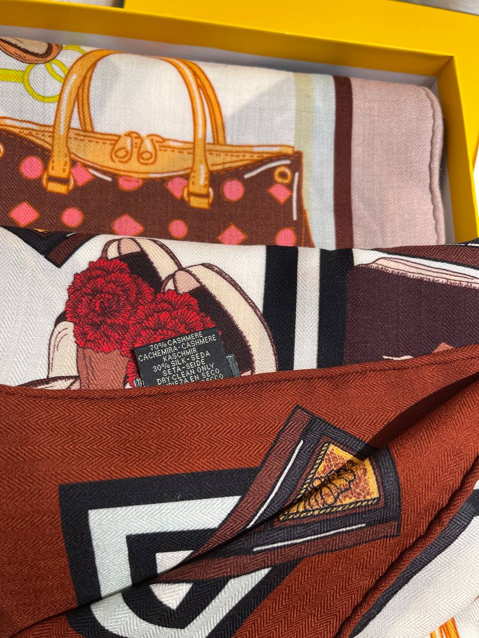 Платок Fendi LUX-125392 – стильный аксессуар, который добавит изысканности в ваш образ. Яркий принт с изображением сумок и обуви делает его уникальным акцентом.