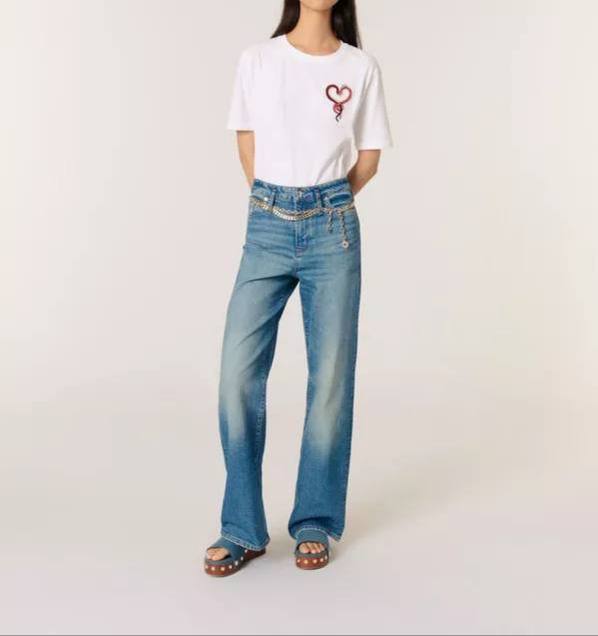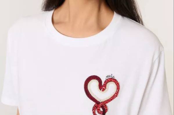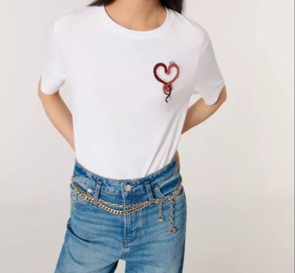Футболка Maje LUX-116779 — это стильная вещь от бренда Maje. Белая футболка с короткими рукавами, украшенная вышивкой в виде сердца с эффектом блеска, идеально подходит для создания повседневных образов. Её универсальный дизайн позволяет сочетать её с различными элементами гардероба.