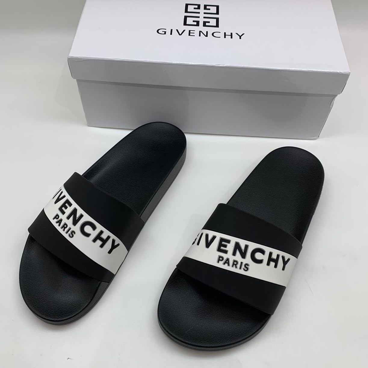Элегантные шлепанцы Givenchy LUX-32799 в классическом черном цвете с контрастной белой полосой, украшенной логотипом бренда и надписью "Paris". Этот стильный и современный дизайн идеально подходит для создания непринужденных, но эффектных образов.