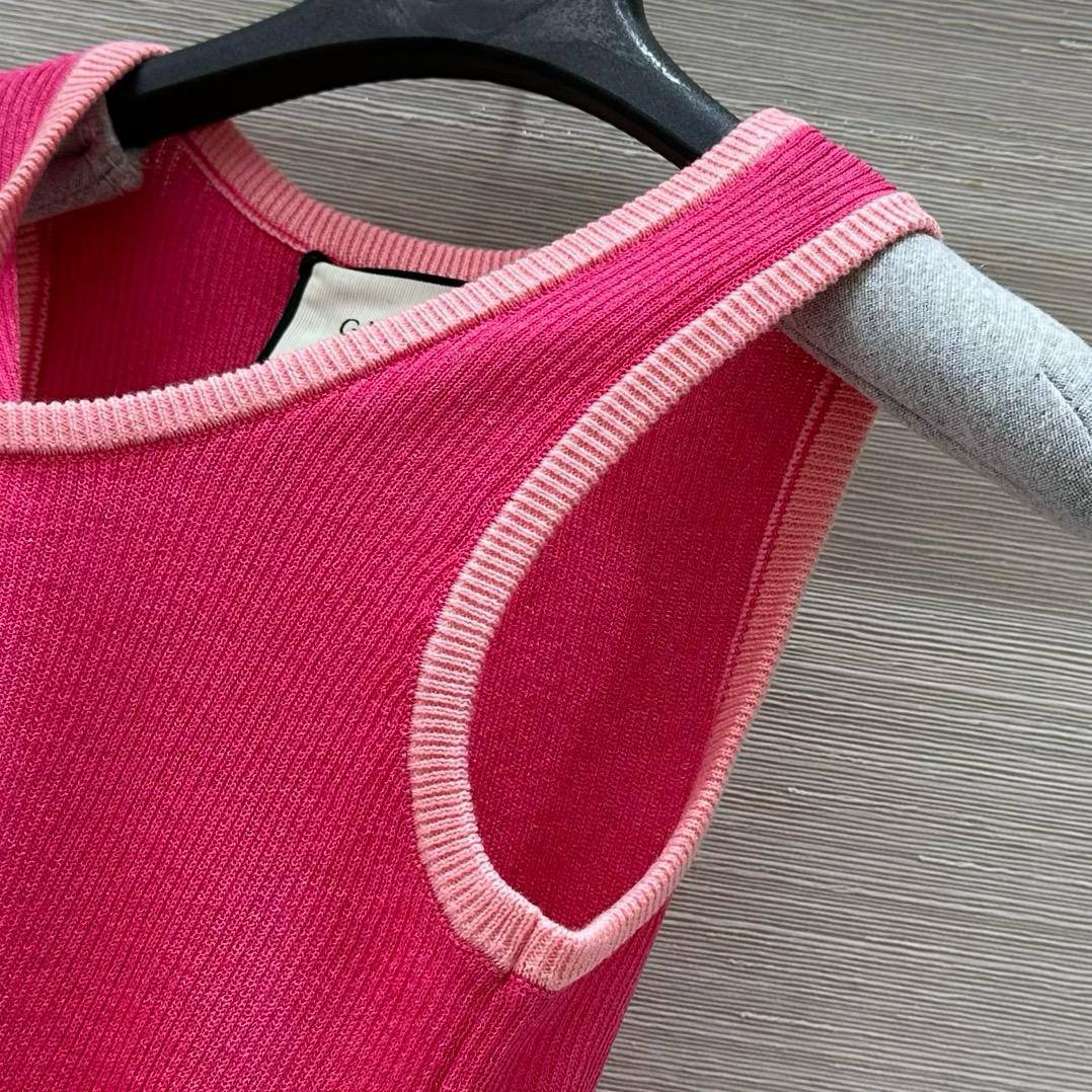 Майка Gucci LUX-115991 – воплощение элегантности и стиля. Розовая майка с круглым вырезом и контрастной отделкой, подчеркивающей силуэт, идеально подойдет для создания стильного образа. Классический фасон майки дополнен небольшим логотипом бренда спереди.