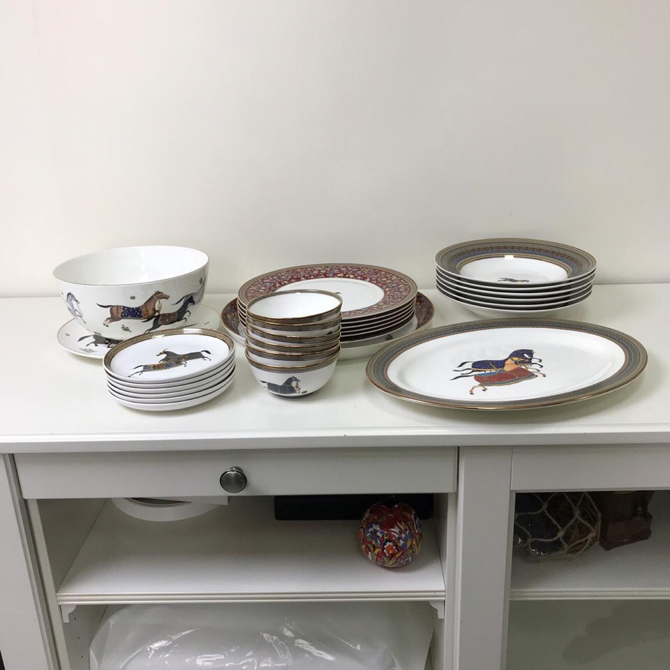 Оригинальная и изысканная коллекция HERMES "CHEVAL D'ORIENT" выполнена в стиле персидских зарисовок к всемирно известному эпическому произведению "Шахнаме",- главному эпосу о древней истории иранского народа. Яркие изображения арабских скакунов в боевых попонах стали главным вдохновением для творцов HERMES, и теперь украшают, пожалуй, самый известный и желанный сервиз французского модного дома. Тарелка обеденная HERMES "CHEVAL D'ORIENT" 26 см х 6 шт Тарелка суповая HERMES "CHEVAL D'ORIENT" 23 см х 6 шт Тарелка закусочная HERMES "CHEVAL D'ORIENT" 15 см х 6 шт Пиала HERMES "CHEVAL D'ORIENT" 170 мл х 6 шт Тарелка десертная HERMES "CHEVAL D'ORIENT" 23 см х 1 шт Блюдо овальное HERMES "CHEVAL D'ORIENT" 26х36 см х 1 шт Салатник HERMES "CHEVAL D'ORIENT" 3 л х 1 шт.