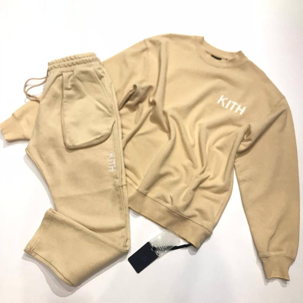 Представлен стильный костюм от бренда KITH, выполненный в минималистичном дизайне. Комплект состоит из свитшота и брюк, оба элемента декорированы логотипом бренда. Этот костюм идеально подходит для создания расслабленных, но в то же время актуальных образов.
