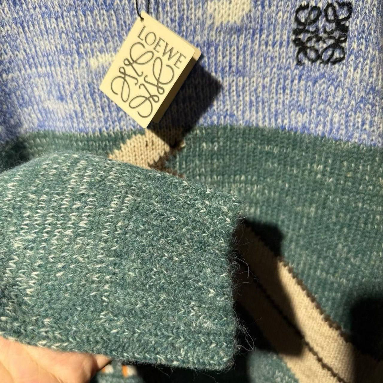 Стильный мужской свитер Loewe с оригинальным дизайном станет ярким акцентом в вашем гардеробе. Модель выполнена в синих и зеленых тонах с изображением пейзажа и кота. Этот свитер подчеркнет вашу индивидуальность и добавит образу неповторимости.