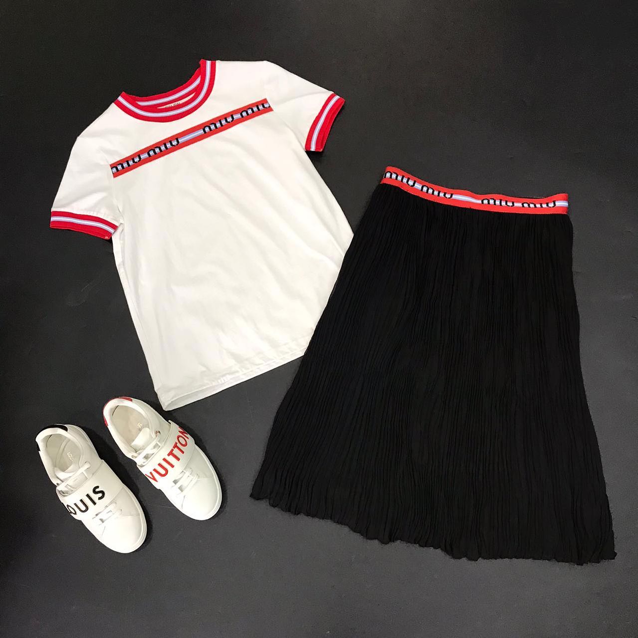 Представленный костюм Miu Miu LUX-33245 — это стильное решение для современной женщины, сочетающее в себе элегантность и спортивные мотивы. Белая футболка с контрастными красно-синими полосами на горловине и рукавах, украшенная логотипом бренда, прекрасно гармонирует с черной плиссированной юбкой. Такой комплект идеально подойдет для создания эффектных повседневных или расслабленных вечерних образов, подчеркивая индивидуальность и вкус обладательницы.