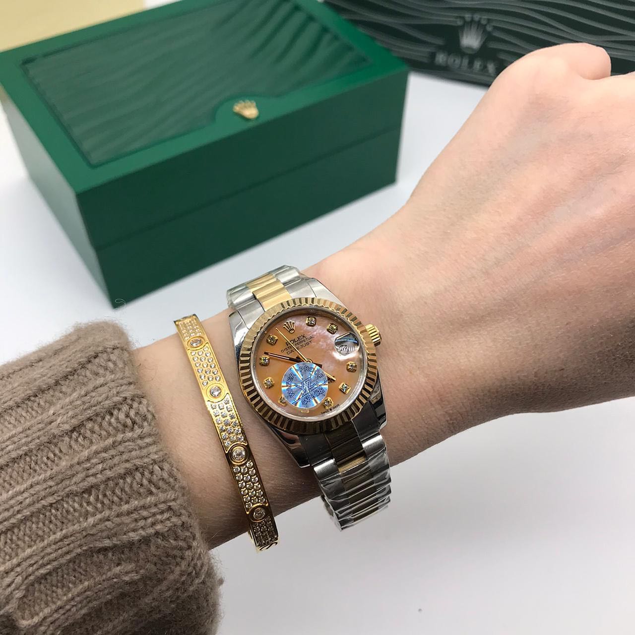 Качество 1:1 к оригиналу. Корпус сталь 31мм, механика с автоподзаводом, стекло сапфир сдерживает мелкие царапины, камни цирконы, циферблат перламутр.