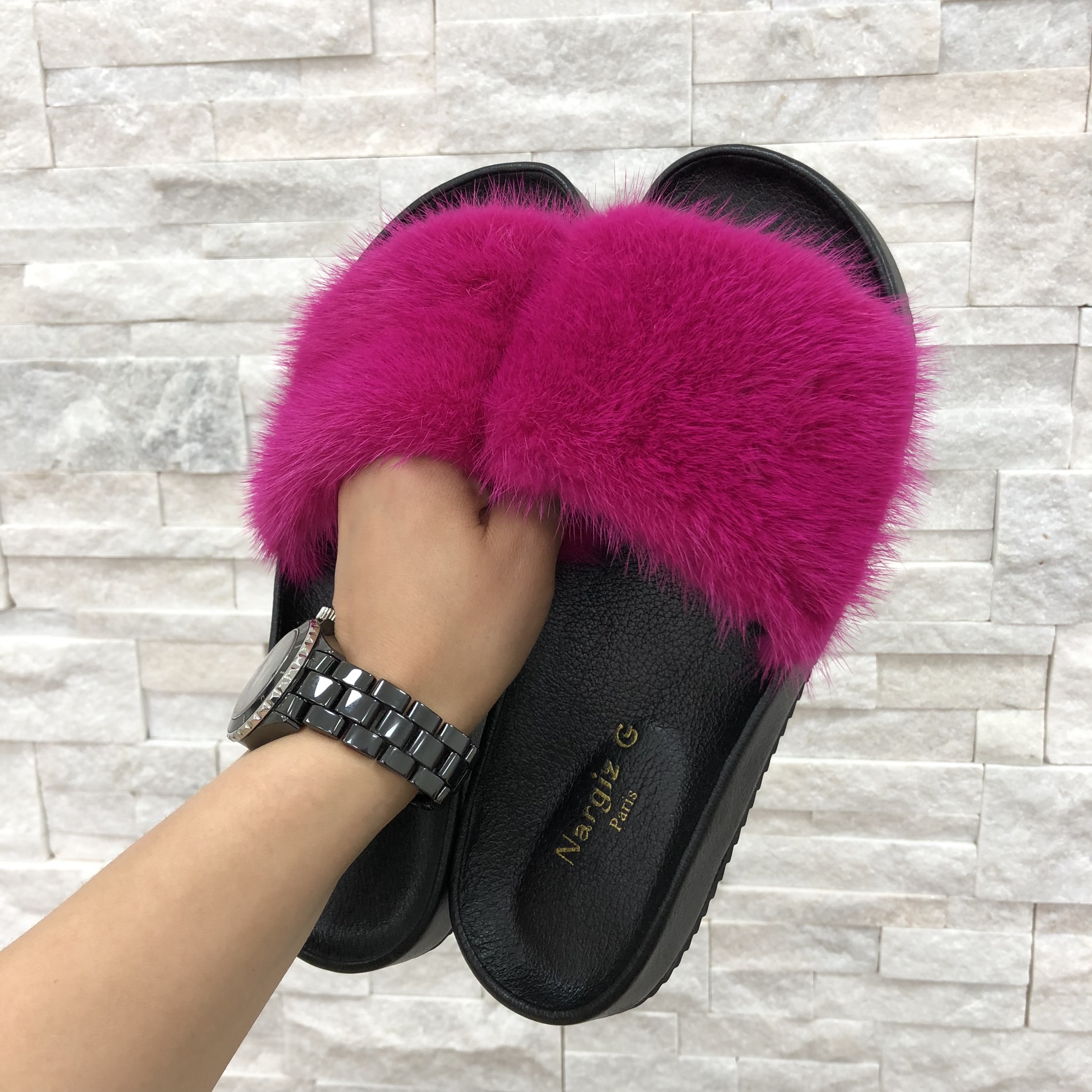 Шлёпанцы Nargiz LUX-14776 — это стильный и комфортный выбор для повседневной носки. Эти элегантные шлёпанцы отличаются оригинальным дизайном, сочетающим минимализм чёрной подошвы с ярким акцентом из натурального меха. Они идеально подойдут для создания эффектных образов как дома, так и на прогулке.