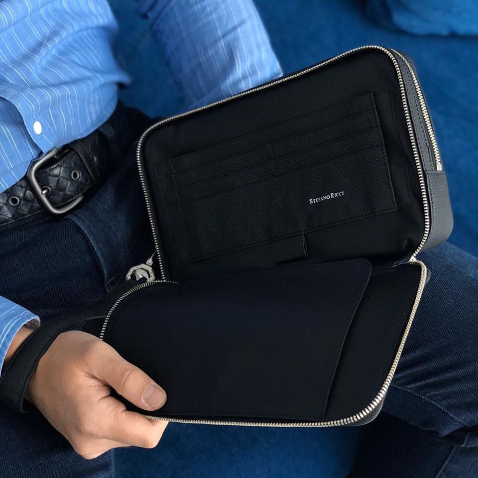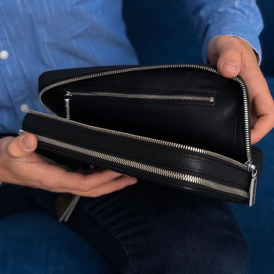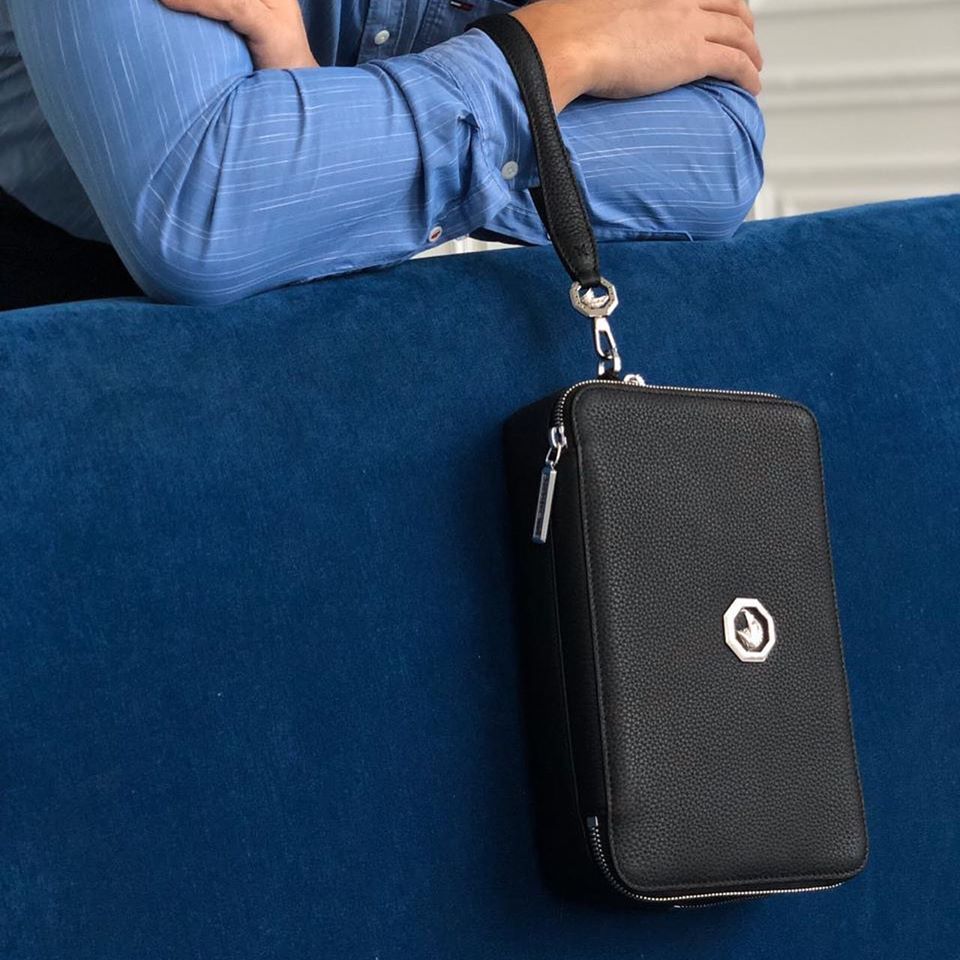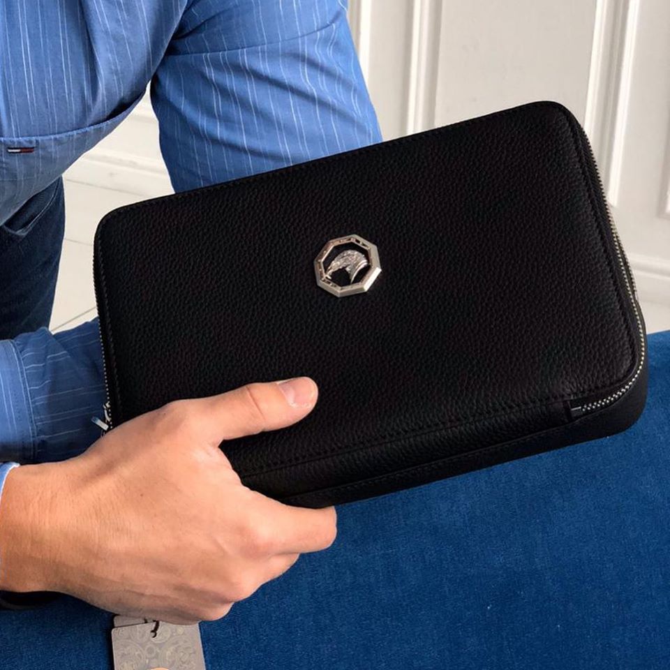 Выполнен из натуральной кожи чёрного цвета. Модель оснащена двумя функциональными отделениями на молнии и кистевым ремнём. Размер 26х17х6 см. Качество 1:1 к оригиналу.