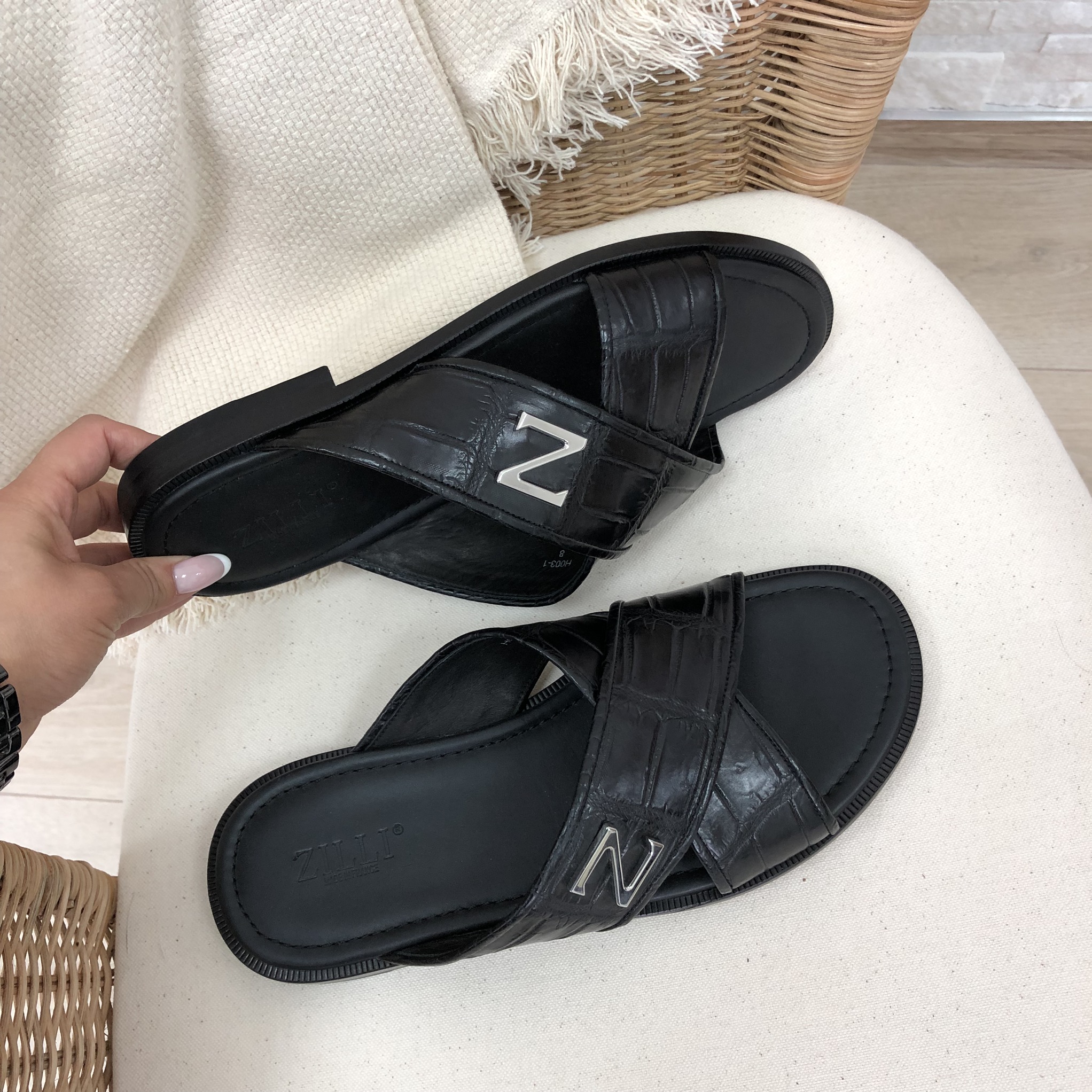 Шлёпанцы мужские Zilli LUX-14819 – это стильное и элегантное решение для теплого времени года. Модель выполнена в классическом черном цвете с фактурой под кожу рептилии, что придает ей особый шарм. Перекрещивающиеся ремешки с металлическим декором в виде буквы "Z" обеспечивают надежную фиксацию и добавляют изысканности. Эти шлёпанцы идеально подойдут для создания непринужденных, но в то же время утонченных образов.